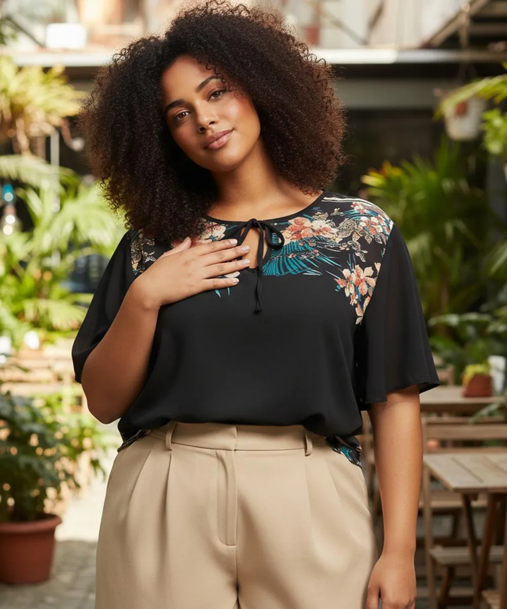 Elegância e movimento em uma só peça. A Blusa combina o fundo preto clássico com uma estampa floral delicada nos ombros. Com mangas flare fluídas e decote com amarração, esta peça em Crepe Bubble oferece um visual sofisticado que não amassa, ideal para quem busca praticidade sem abrir mão do estilo.